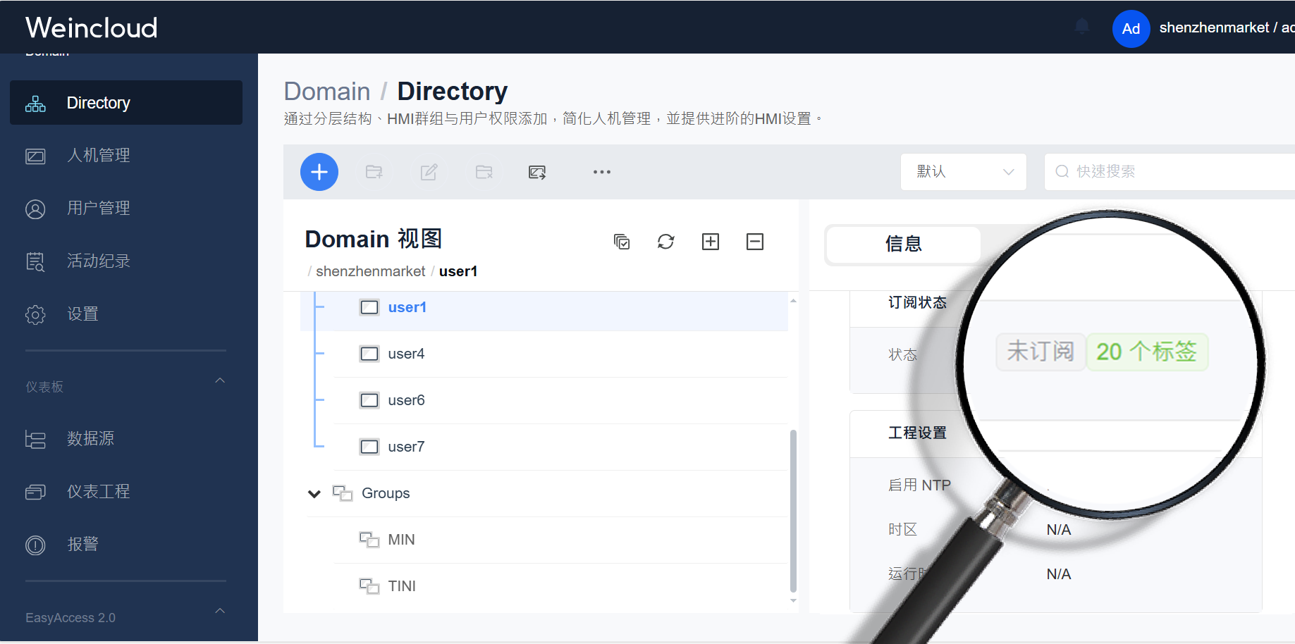 Directory 采用資料夾分層結構,在 Domain 下可依照需求使用資料夾來分類,以及將資料夾作為Subdomain,指定特定用戶來管理 Subdomain 下的 HMI 及用戶。