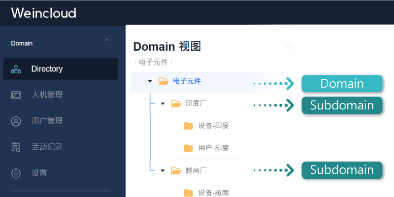 以下圖為例: 一家跨國電子公司,分別在越南、印度等地區設廠。管理者將設備、操作人員分配至各地區的資料夾下,最后設置操作權限,立即完成權限管理。