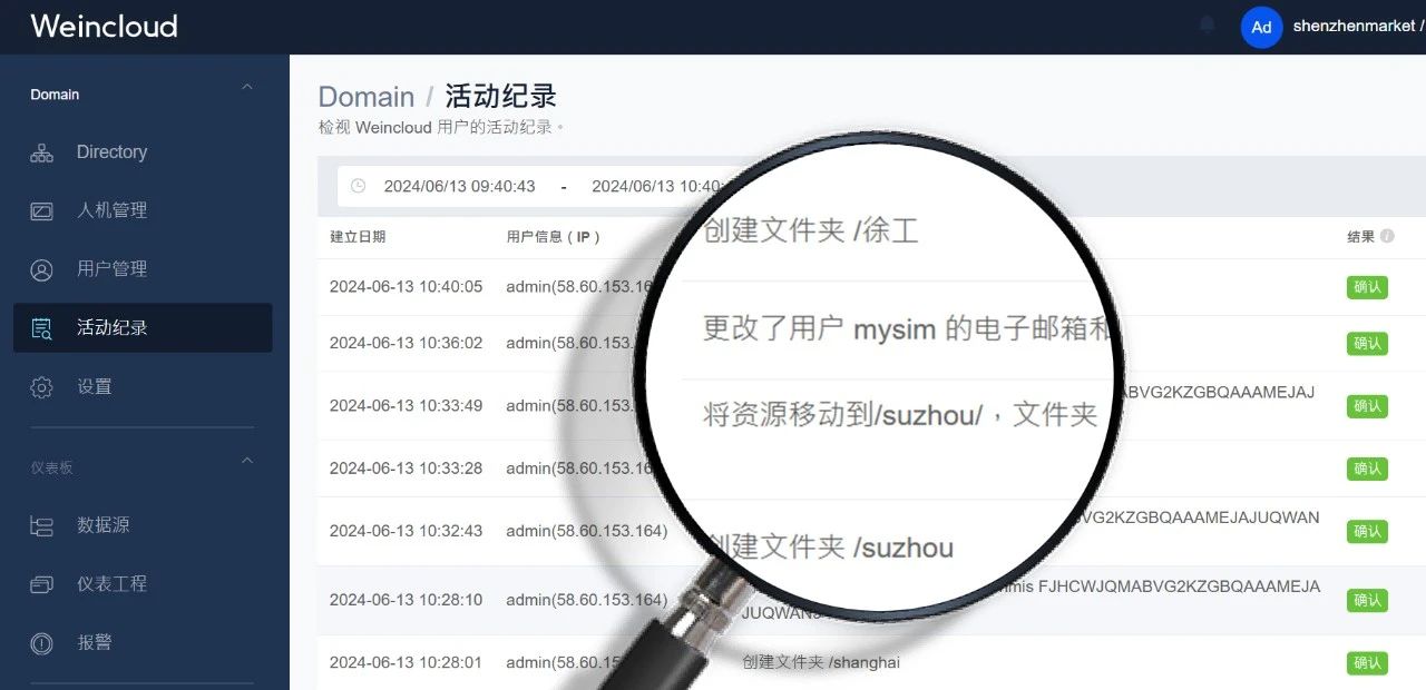 除了靈活的權限管理,Weincloud 還提供詳細的活動記錄,幫助管理者采集用戶行為,包括登錄記錄、密碼修改、權限更改…等。這有助于提升系統的安全性,憑借著完整的人員行為追蹤,確保快速找到發生各種異常的原因。