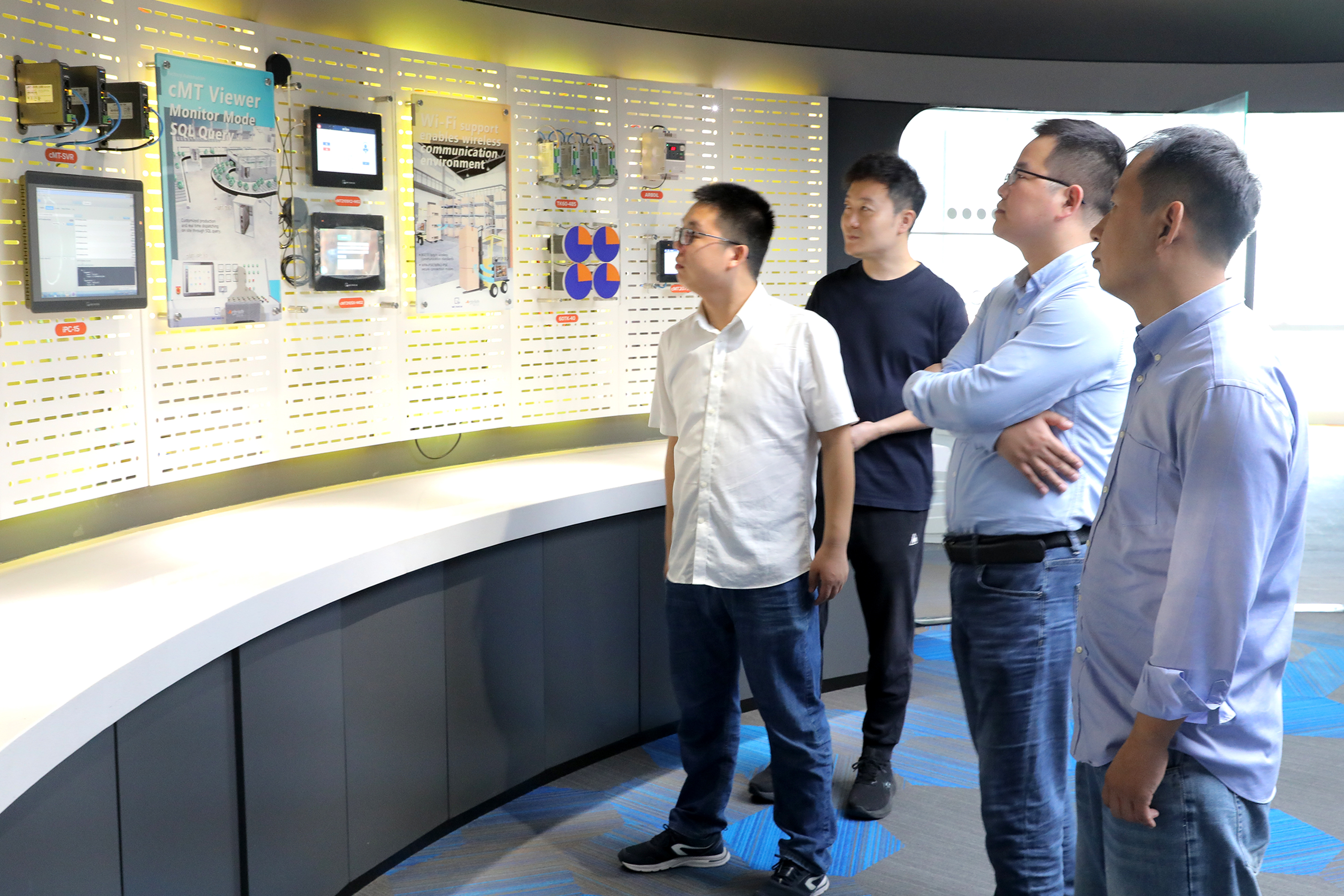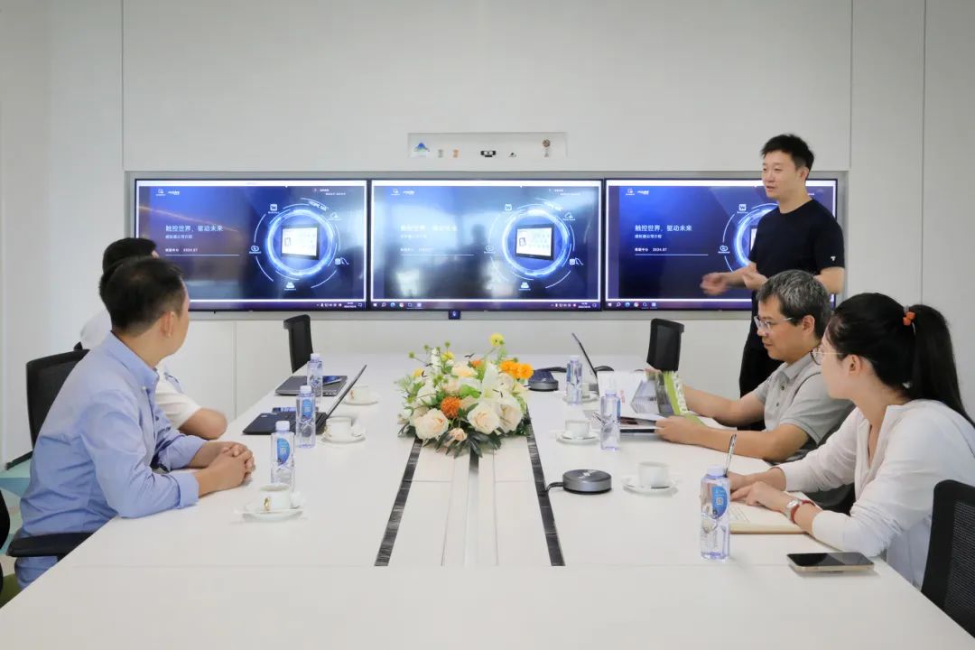 參觀過程中,劉成林向來訪領導介紹了威綸通企業(yè)發(fā)展歷程以及新一代cMT X系列云端監(jiān)控HMI產(chǎn)品,通過現(xiàn)場演示與互動體驗,展示威綸通完全運用自主控制系統(tǒng)(HMI+I/O)結合CODESYS軟PLC方案實現(xiàn)的對現(xiàn)場能源管理、照明、空調(diào)、窗簾、電源、音響等設備進行管理的自動化智能辦公系統(tǒng)。讓HMI與CODESYS相結合的優(yōu)勢展露無余。CODESYS(歐德神思)對威綸通的創(chuàng)新能力和研發(fā)實力給予了高度的認可。