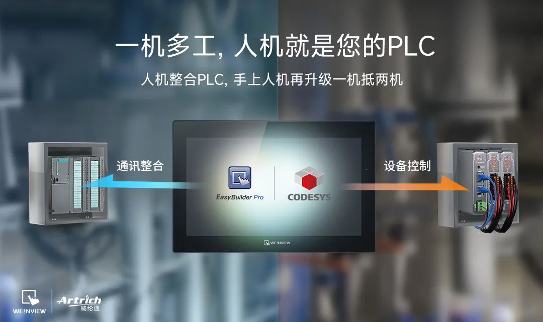 威綸通早在2017年就開始了與CODESYS在產(chǎn)品研發(fā)端的合作,目前主推的cMT X系列人機界面支持CODESYS可編程控制功能,可實現(xiàn)直接對遠程I/O進行通訊和控制,同時借助其本身的多元監(jiān)控及IIoT能力,能夠滿足用戶低成本對設備進行人機監(jiān)控+邏輯編程+運動控制+數(shù)據(jù)整合的應用場景,實現(xiàn)“一機多工,人機就是您的PLC”!